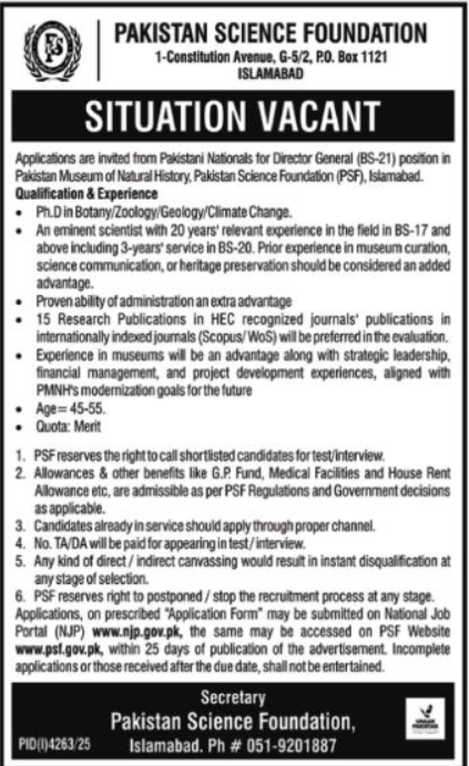 • Pakistan Science Foundation Islamabad Vacancies 2025